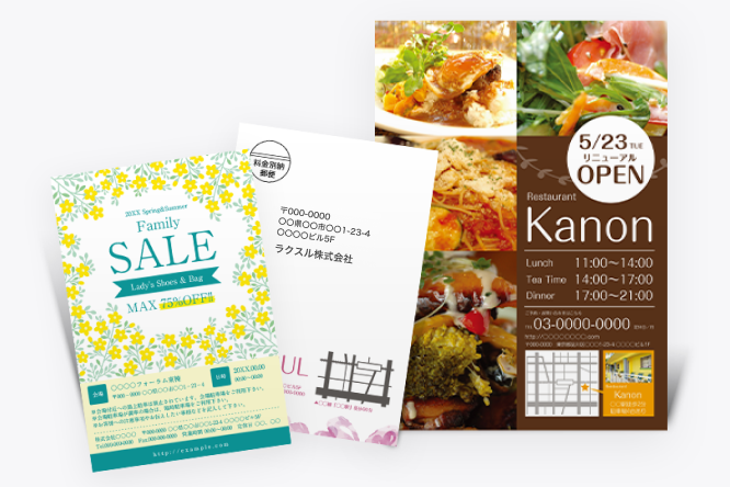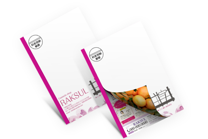めくると中身が見えるはがき。2つ折り、外3つ折りの2種をご用意。通常はがきの数倍の情報量を掲載でき、開封率の高いDMにおすすめです。