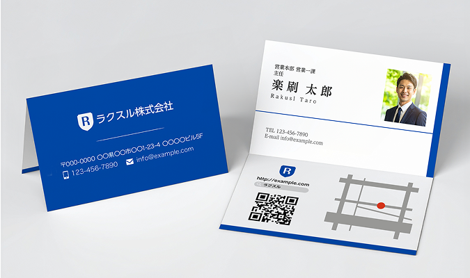 二つ折りサイズ名刺は、通常の名刺サイズを横または縦に二つ折りにしたタイプ(展開時:91×110mm)です。折りたたんだ状態では通常サイズと同じ大きさになるため収納しやすく、展開すると2倍の情報を載せられるのが特徴です。企業のサービス紹介や個人のプロフィールを詳しく載せたい場合に最適です。