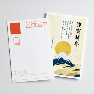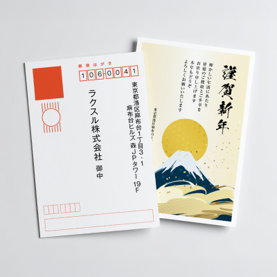 ラクスルの年賀状はすべてお年玉付き年賀状です。宛名面には郵便番号枠や年賀マークが元から印字されています。